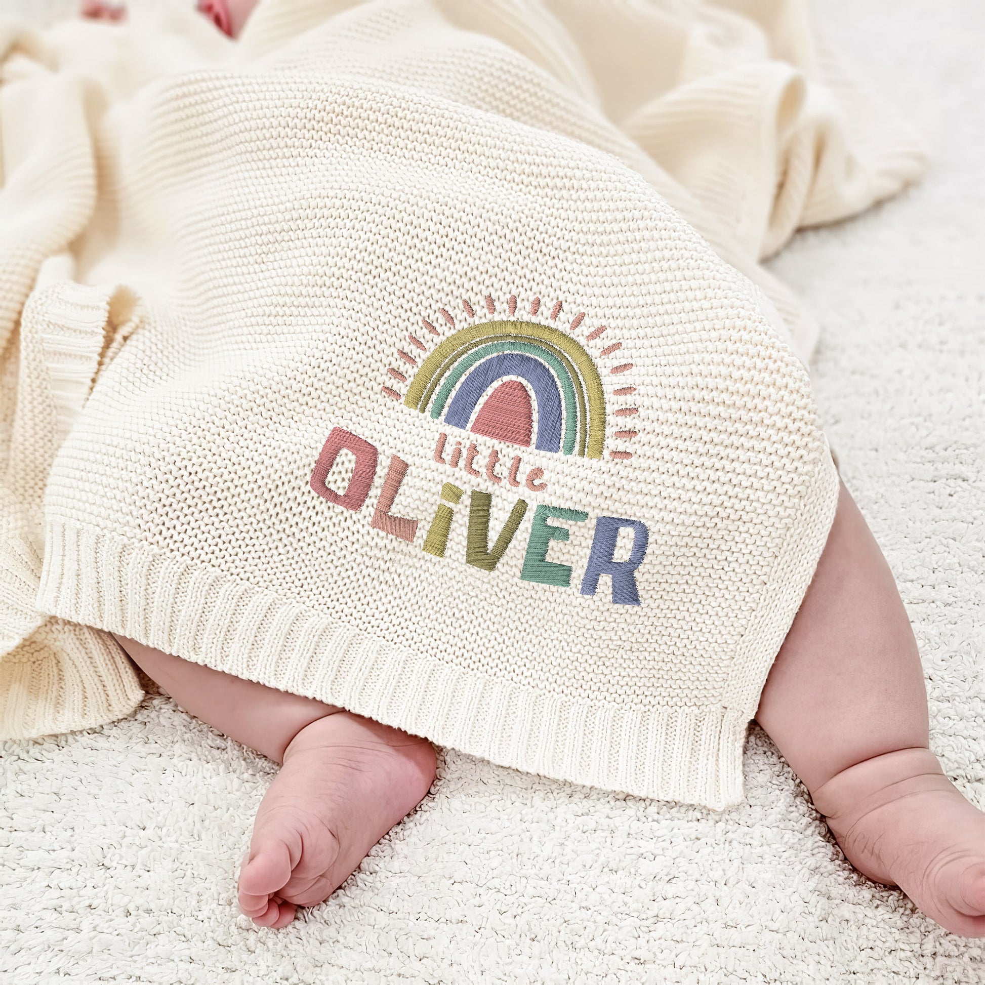 Personalized Baby Blanket with Rainbow and Name – Custom Gift for Baby Oliver | Soft Knit with Boho Design